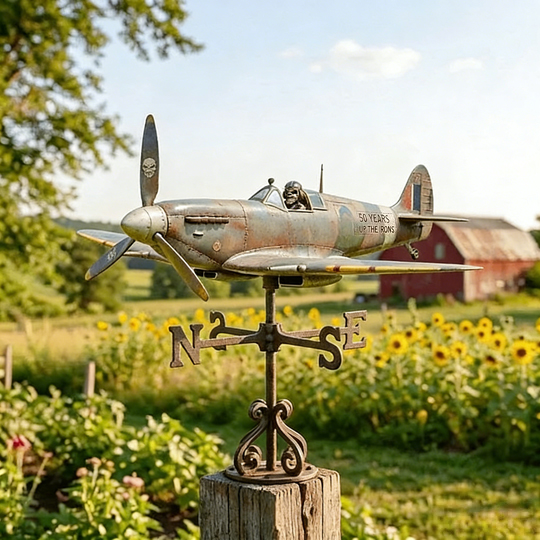✈️ Crafted from durable, weather-resistant metal with a rugged, vintage camouflage finish, it stands proudly on a sturdy pole and adds striking movement to flower beds, lawns, patios, or rock-themed landscapes, with Eddie piloting the iconic Spitfire popping beautifully against blooming flowers and open skies.